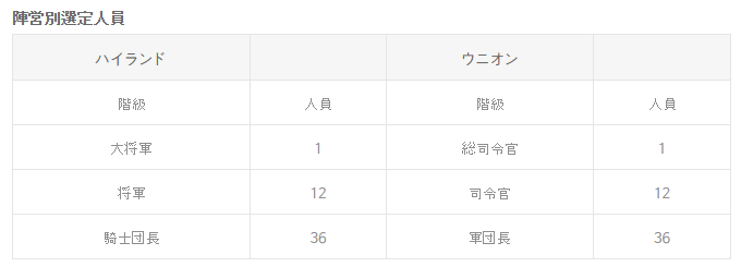 昇級審査とは、各陣営の最高ランクに挑戦する審査でハイランドは、大将軍/一般/騎士団長、ウニオンは総司令官/司令官/軍団長ランクを獲得することができる。