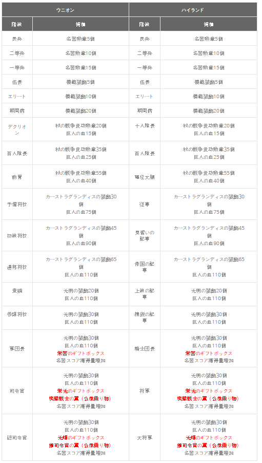 キャラクターが過去7日間獲得した名誉点数に応じて功績が決定され公的に応じて階級が決まる。